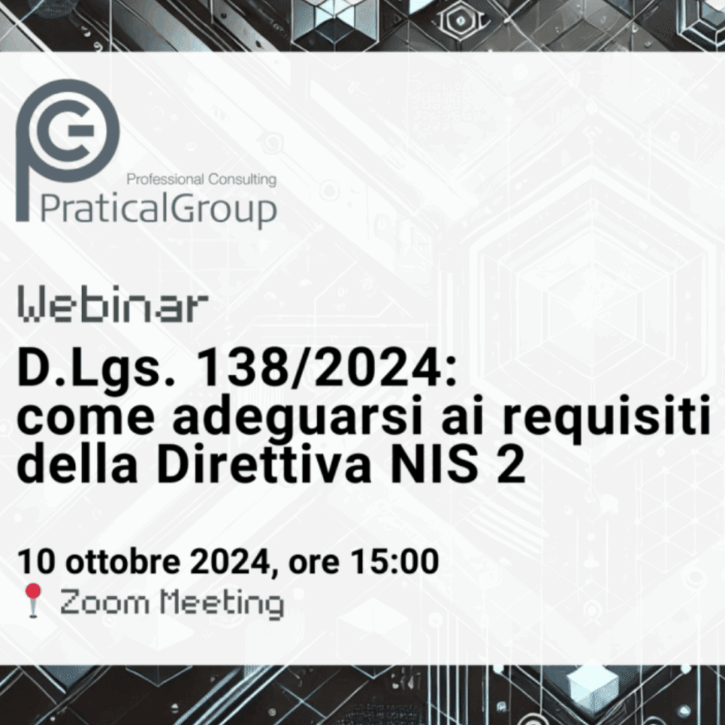 Il 10 ottobre 2024, CMG Swiss ha partecipato con interesse e spirito di condivisione al webinar organizzato da Pratical Group [https://www.praticalgroup.it] dal titolo “D.Lgs. 138/2024: come adeguarsi ai requisiti della Direttiva NIS 2”. CMG Swiss al webinar su NIS 2 e D.Lgs. 138/2024: focus su cybersecurity e governance a supporto di enti pubblici e aziende private. L’evento ha rappresentato un importante momento di aggiornamento sui nuovi obblighi in materia di sicurezza informatica.