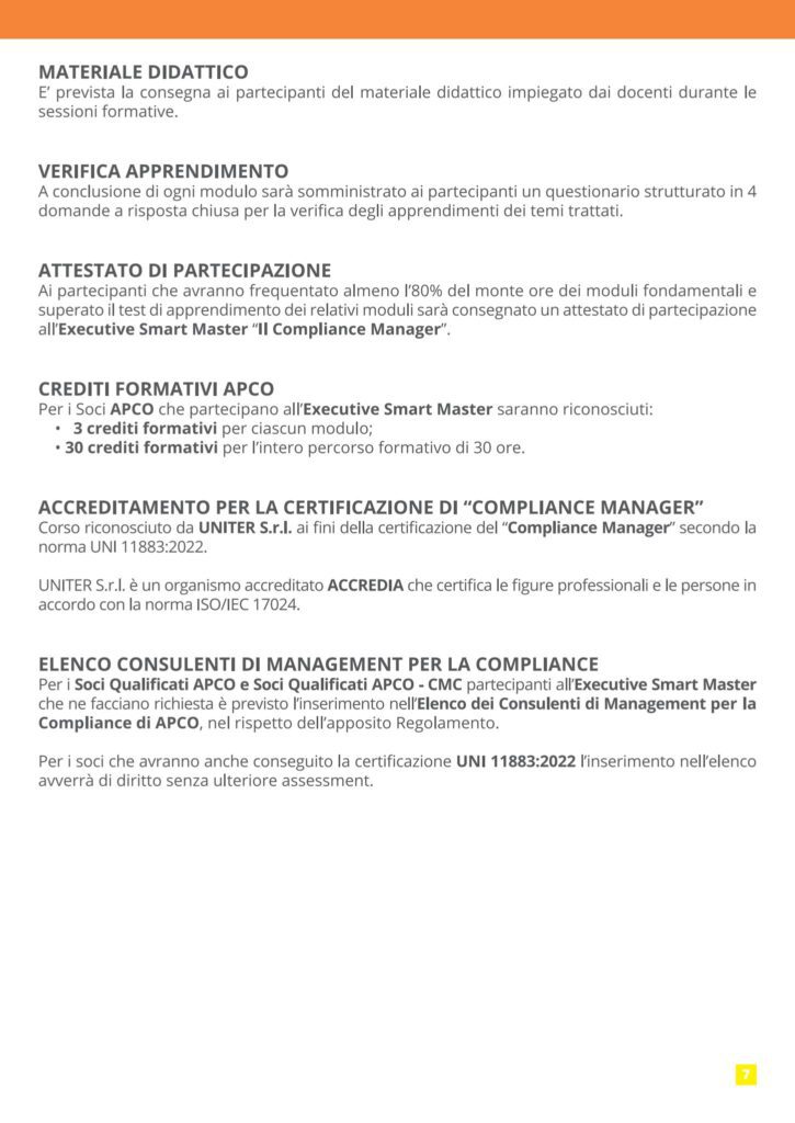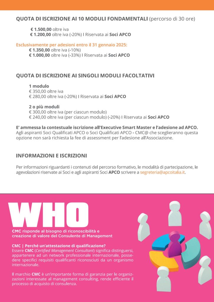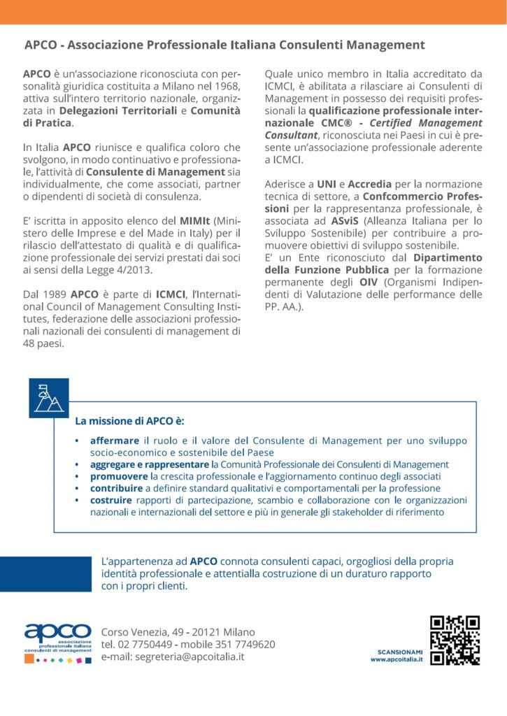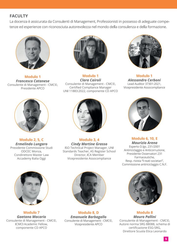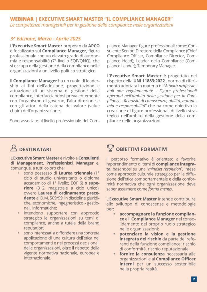 CMG Swiss, realtà svizzera di riferimento nei sistemi di gestione e nei modelli organizzativi, partecipa attivamente al prestigioso Executive Smart Master in Compliance Management – Prima Edizione 2025, promosso da APCO – Associazione Professionale Italiana dei Consulenti di Management. La CEO, Cindy Martine Grasso, interverrà in qualità di docente ai Moduli 3 e 4, offrendo il contributo di CMG Swiss alla formazione di alto profilo nel campo del compliance management.