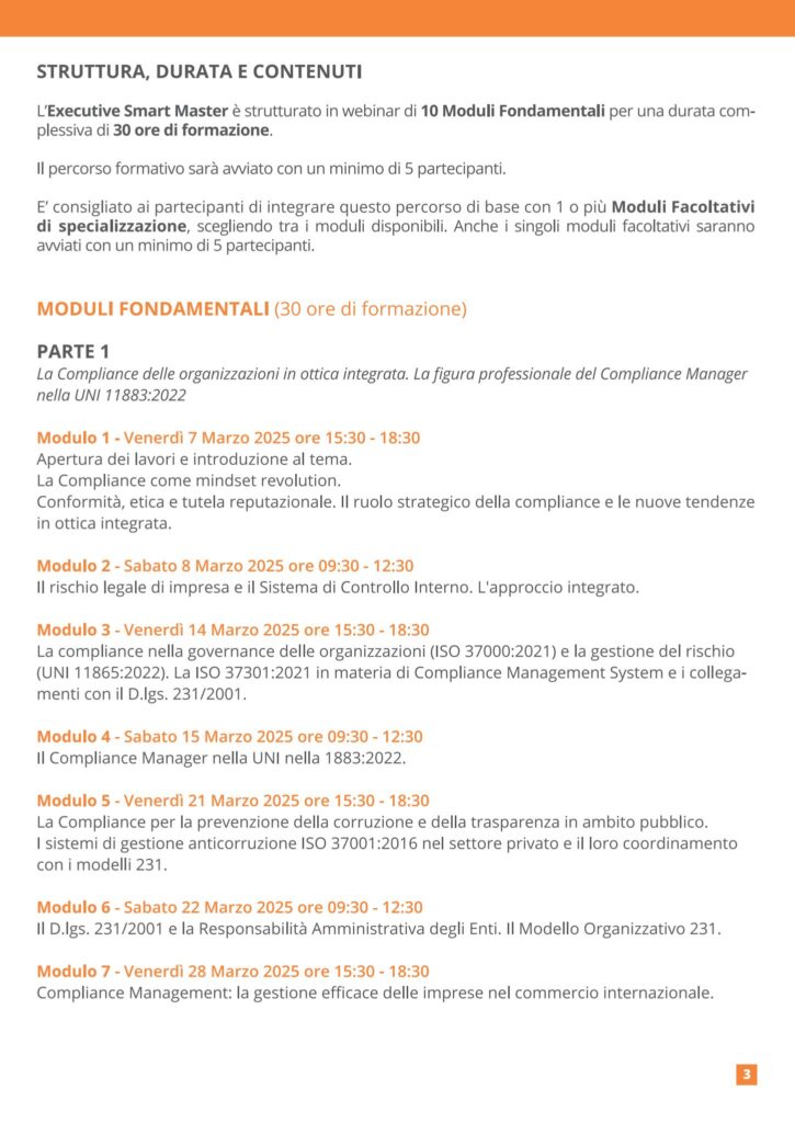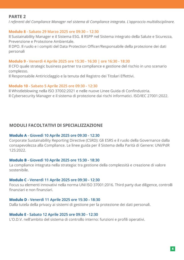 Il Master, che si terrà nel mese di marzo 2025, è strutturato con un approccio pratico-operativo e si rivolge a professionisti interessati ad aggiornare le proprie competenze su compliance integrata, gestione del rischio e governance sostenibile.